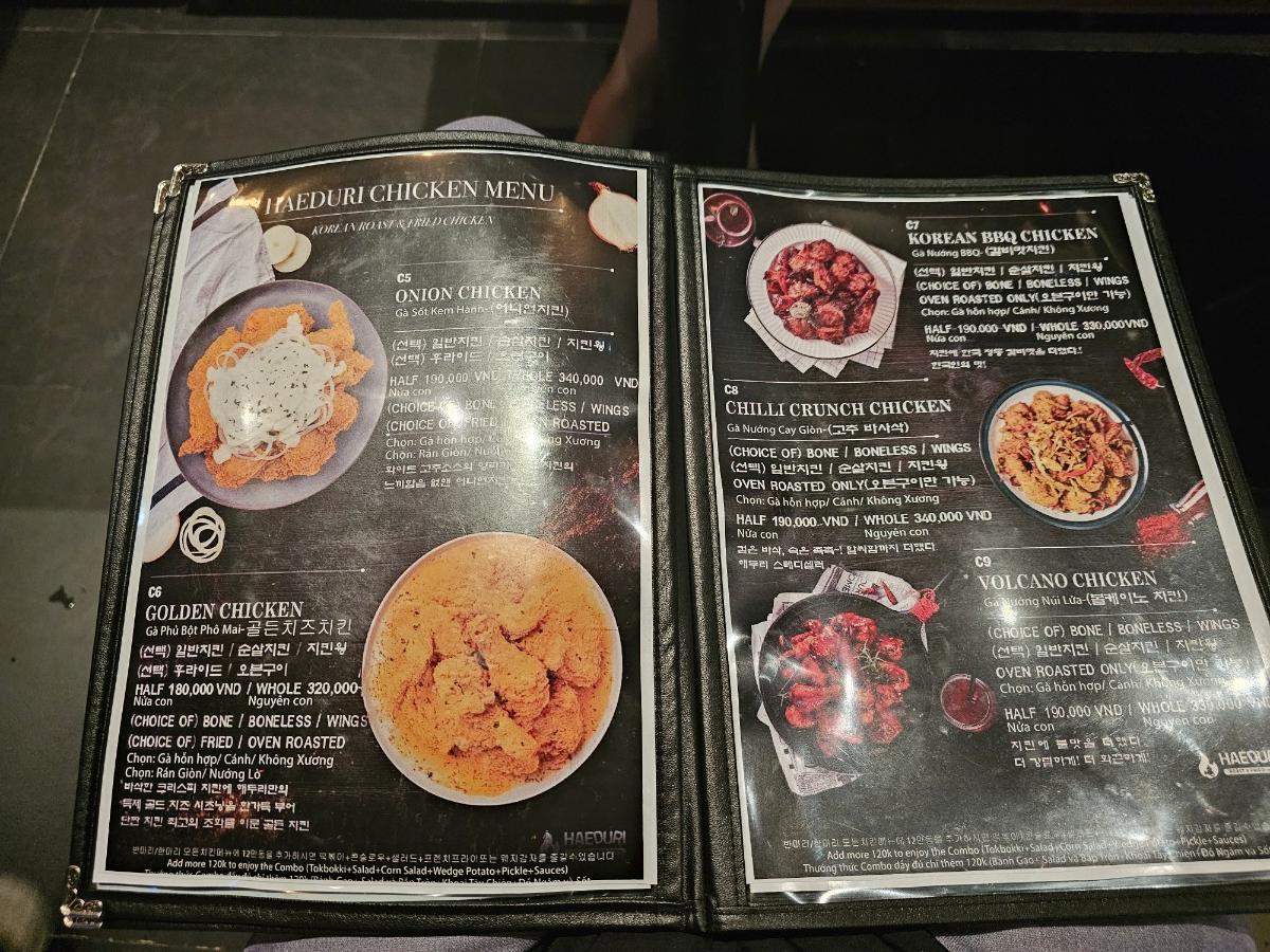 메뉴판이 베트남/영어/한국어, 3가지 언어가 있다보니 가독성이 떨어지긴 하는데 여러 메뉴가 참 많네요, 저희는 심플하게